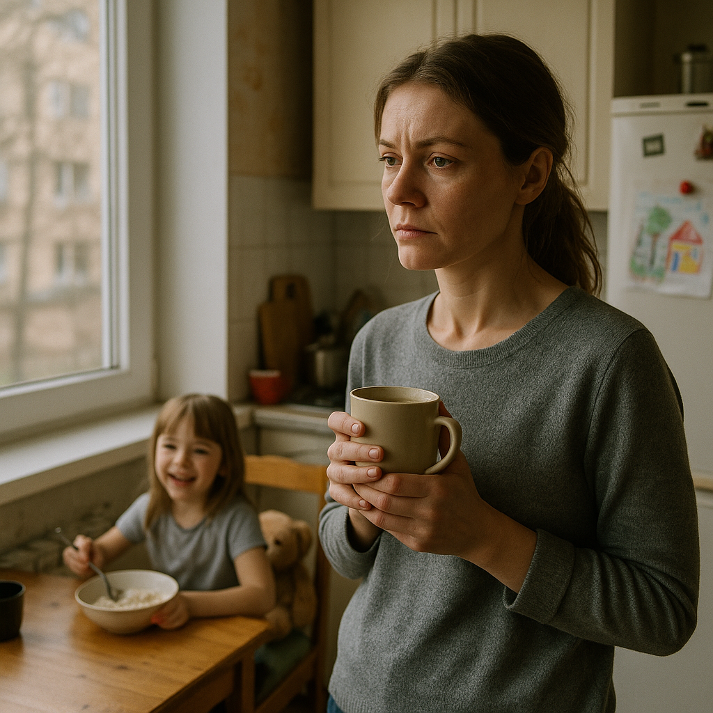 Утро. На плите уже томилась каша, комната пахла новыми шторами и чем-то тёплым, домашним. Лизка сидела на табуретке, болтала ногами, постукивала ложкой по краю тарелки и что-то напевала себе под нос. Свет мягко ложился на подоконник, всё вокруг казалось непривычно спокойным — как будто этой тишине давно было здесь место.